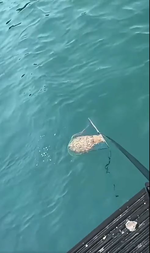 In the video, a large cuttlefish floats near the ocean surface, ejecting dark ink clouds as a fisherman attempts to scoop it with a long-handled net. The cephalopod releases ink in precise bursts—a survival tactic evolved over 200 million years.